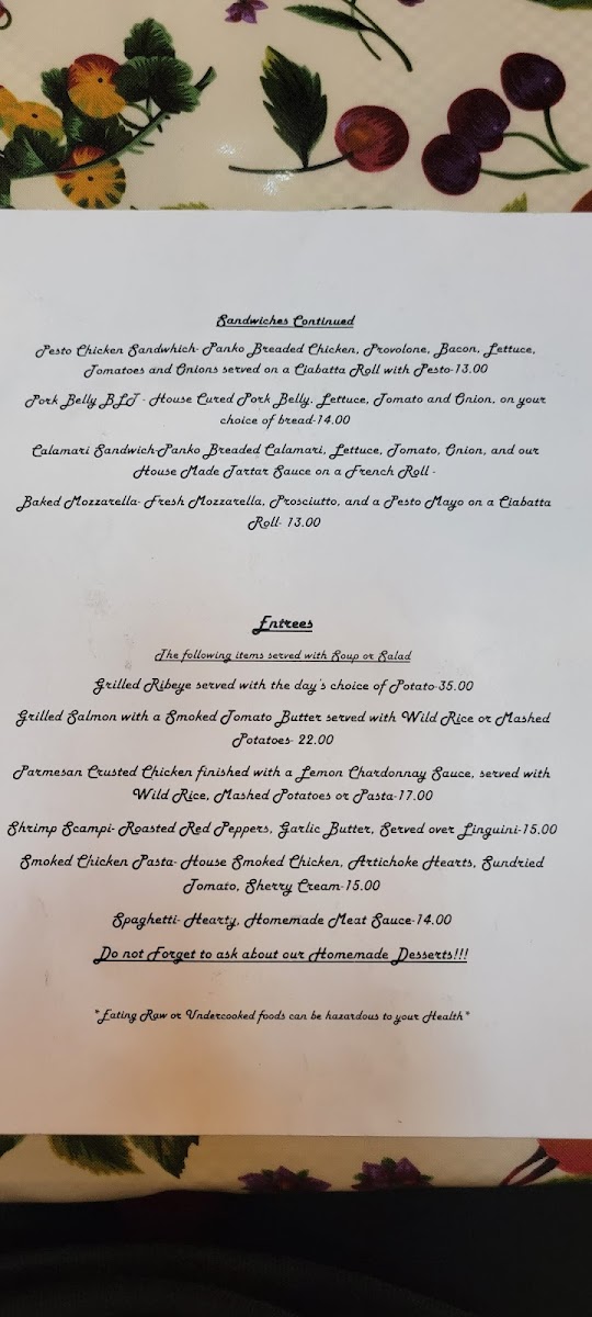 Start the day with hearty options like steak and eggs, breakfast enchiladas, or French toast, all served with a sense of homemade care and a touch of rustic charm. As the day moves on, casual sandwiches such as a pesto chicken or calamari sandwich make for satisfying lunch choices, while dinner highlights like ribeye steak, shrimp scampi, and parmesan-crusted chicken bring a bit of elevated comfort to the table.